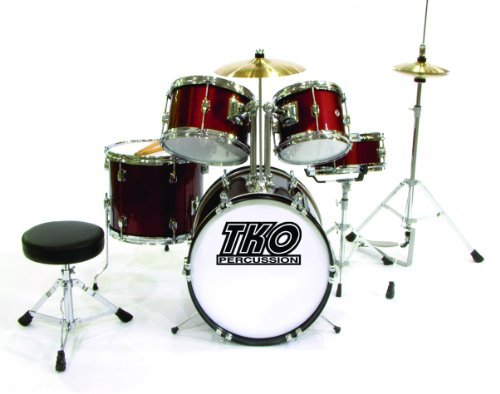 This complete TKO101 Junior drum set is sized just right for the young student drummer. Its durable quality will hold up under hard playing. Features fully tunable top and bottom heads, real wood shells & chrome plated metal hardware! The snare drum (10") and adjustible angle small toms (8" & 10") have 4 lugs each. The floor tom (13") and bass drum (16") have 12 lugs each. Attractive color-matched inlaid rims on the bass drum give this drum set a pro-like "look". Includes: bass mounted cymbal holder, snare drum stand, and drum stool (all adjustable height), spring-loaded bass drum pedal, 10" brass ride cymbal, hi-hat stand with a pair of 8" brass hi-hat cymbals, drum sticks and tuning key. Recommended for ages 3 to 7 and smaller 8 year olds. Makes a wonderful music gift for kids! Replacement parts are also available. Some assembly is needed for this drum set. Easy set-up instructions are included. Also available in black and these metallic colors: blue, red and silver.